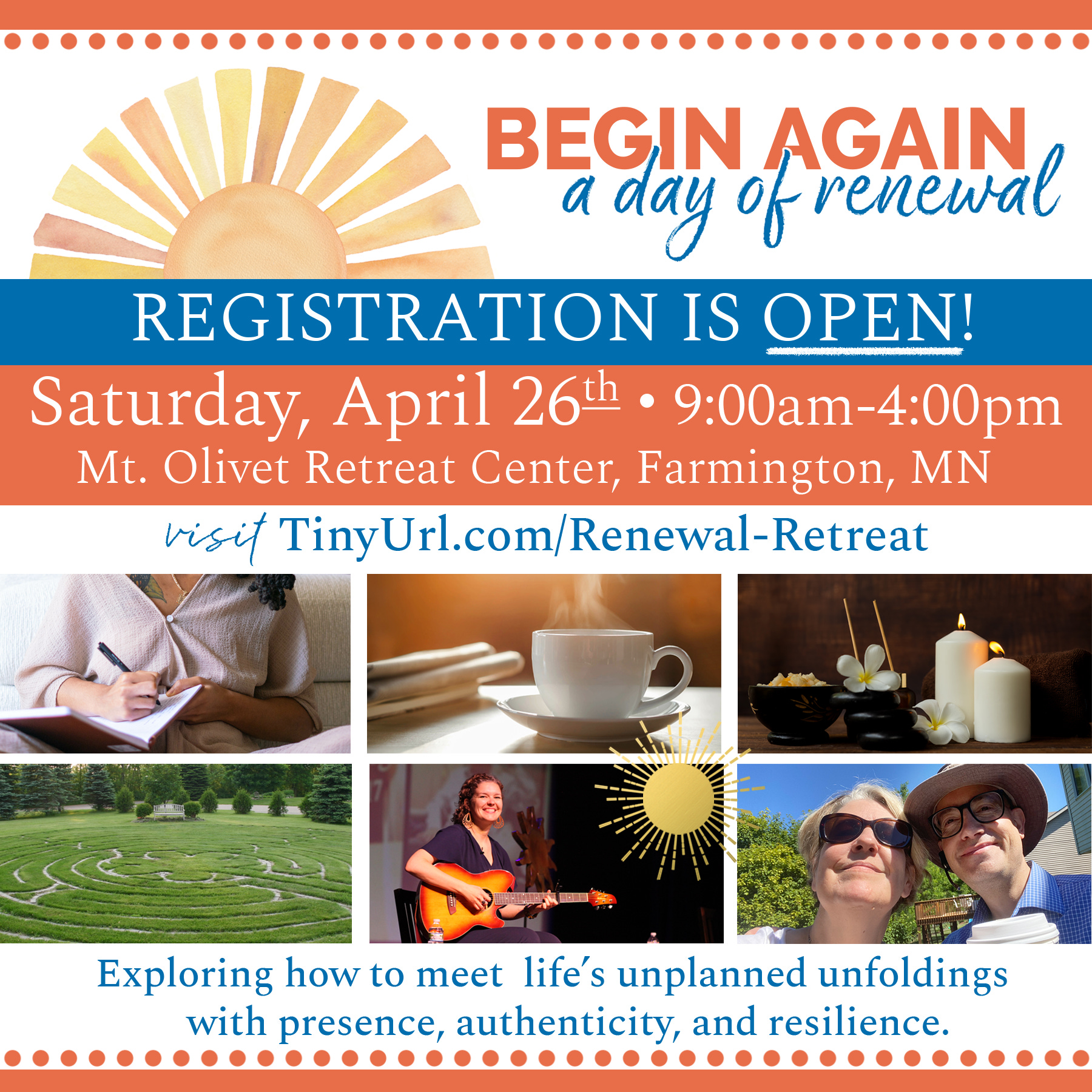 One thing that Andy and I are starting to commit to doing together is, in partnership with Lynn O’Brien, taking the lessons we’ve learned and stories we’ve discovered over the last eight years and trying to use them to not only help us grow toward the light, but to invite others to do the same. We are stepping up our efforts to invite others into our community, to explore stories of resilience, struggle, hope, and pure JOY (a-hem, the first sign of tulip bulbs 🌷). Our next offering a full-day retreat on Saturday April 26th at Mt. Olivet Conference and Retreat Center in Farmington, MN. If you are looking for fresh ways to explore renewal in your own life, we invite you to join us. Or consider sharing with someone who might benefit from the lens of renewal. You can learn more about the offering here: