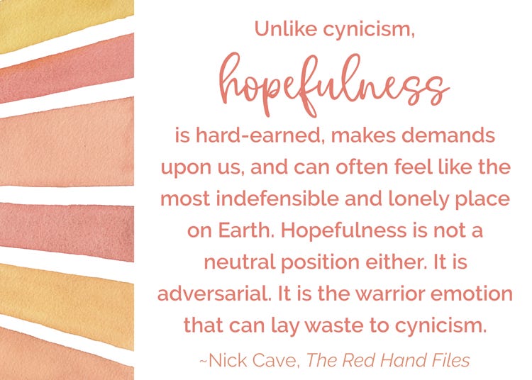 About a month ago, musician Nick Cave was a guest on The Late Show with Stephen Colbert. It was a powerful interview, and I was especially struck by Cave’s take on hope. Cave, who has suffered tremendous loss in his own life, started a website called The Red Hand Files where he answers questions from readers. In the following clip from the interview, he shares with Colbert a question he received from a reader who wonders if, with all the cynicism in the world, Cave “still believes in us (human beings).” Take a listen… (note: if reading this in your inbox, this link may pop you over to YouTube to listen and then we invite you to return to the email.)